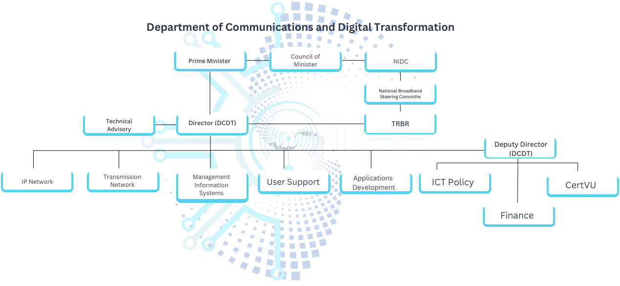 The graphic below shows the organizational placement of the Department of Communication & Digital Transformation (DCDT) within the Government of Vanuatu, and also the main DCDT divisions.